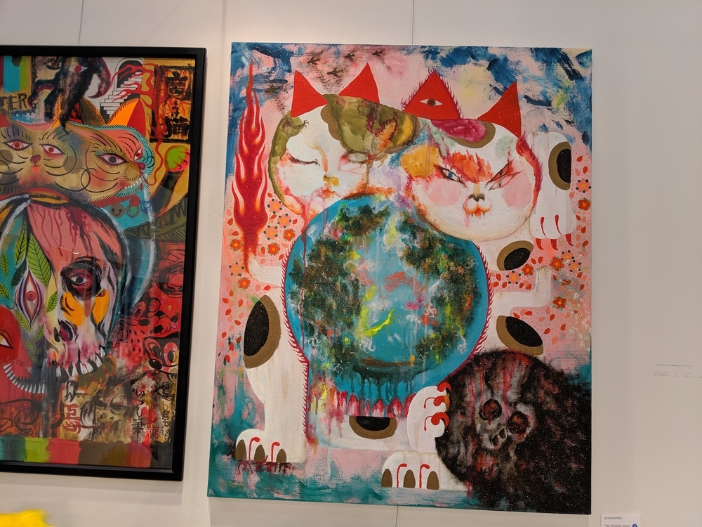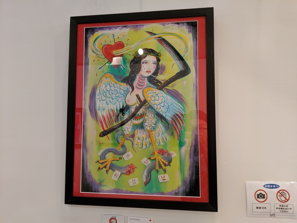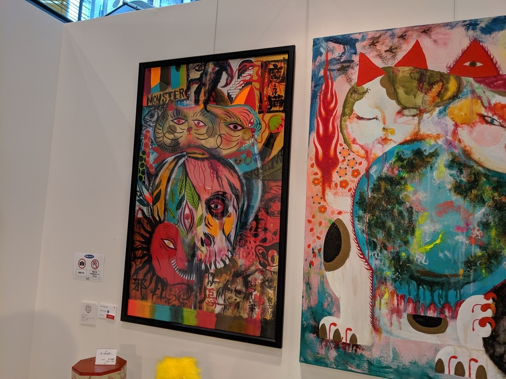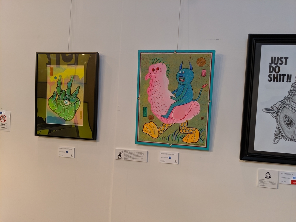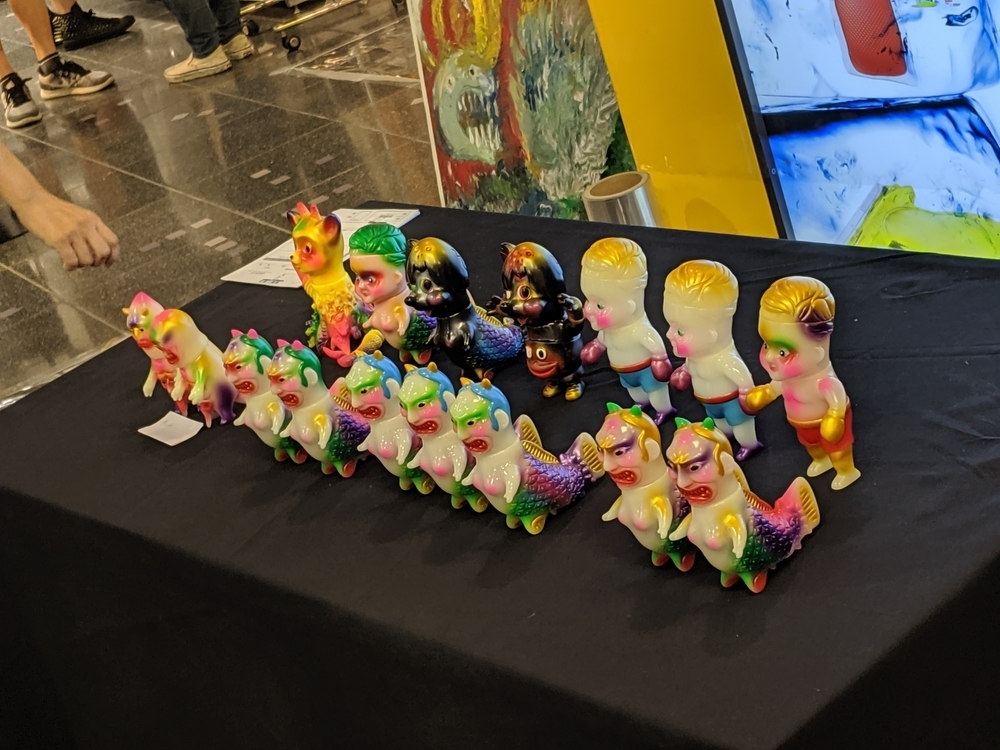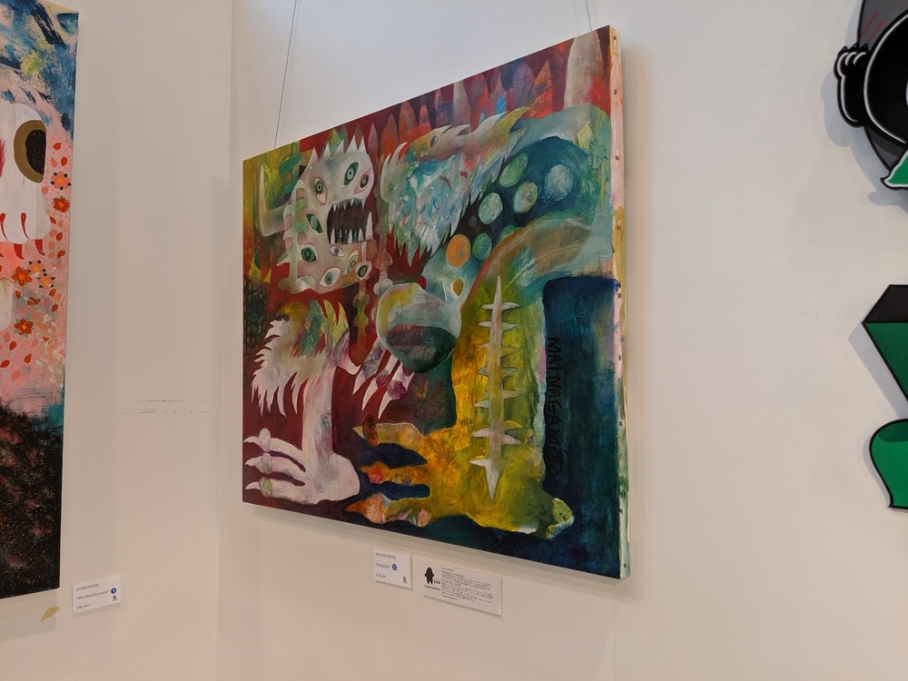 KONER GALLERYさんは、ロウブロウアート(アンダーグラウンド・コミックスやパンク・ミュージック、ホット・ロッドのストリートカルチャーにそのルーツを持つ大衆文化運動)を中心に、日本から世界に独自のアート・カルチャーを発信するブランドです。 公式サイト -ART&MERCHANDISE ONLINE STORE イベントスケジュール。 LAiNNYさんのカスタムペイントも今日だと勘違いしていました。 会場の様子。 イズモさんのソフビは、当初10個でしたが、最終的には15個限定となりました。ワンオフ品? を一部含みますが、既に販売されたカラーリングで、交換対応用のストックか、サンプルのものだったのかもしれません。 僕の狙いはサベージキッドでした。一個づつの販売と思っていましたが、セット販売! ライブペイント編。 HIDEYUKI KATSUMATAさんのライブドローイング。 ナガモトマイさんとイズモさんは同時にペイント開始。 両者、手を使って作品を作成されていきますが、どちらも異なる進め方でした。 ナガモトマイさんは、とても大胆にブルトーザーで地面を慣らすかの如く絵の具を広げ、絵の輪郭は一気に見えてきます。 一方、イズモさんは絵の具を触接キャンバスに落として、手で繊細に伸ばしていきます。下地からゆっくりと作っていって、なかなか何を描いているのか見えてきません。 ここでイズモさんは一度キャンバスを乾かします。 龍のような輪郭がみえます。 ナガモトマイさんは一気に描き続けます。 完成後、やっと勇気を出してお話することができましたので、どういう気持ちで描いたのかお聞きすることができました。普通はキャンバスが乾かないうちに描き出すと色が混ざってしまって、いい色が出ないそうです。それでも描いてしまうのは、おそらく、乾かしている内に気持ちの勢いが逃げてしまうような感じがするのだと思います。マイさんは、「くやしいから」という独特の表現をされていました。 今回の絵の見どころは手足です。最近は手足の部分に特に力を入れて描いているそうです。今回は、それが功を奏して、手足をしっかり描いている内に他の部分が乾くことで、自分でも新境地に達した作品になったそうです。 会心の出来! こちらがイズモさんの完成状態。 実は、乾かしているって気づかなくて、完成したと思ってしまい、一時席を外してしまっていました(汗)。 この間の様子は、他の方のインスタグラム等に上がっていると思います。 抽選会の様子。 SNSのアカウントを言って、抽選券をもらう方式でした。 当選数は少ないですが、東京のイベントに比べたら、倍率は悪くなかったと思います。 んが……ハズレました! 泣きの一回もハズレ! 片方は持っているものと同じでしたので、当選しても悪いし……辞退しようと……そんな心配いりませんでしたねッ! 最後に、いっぱいあるのに、なぜか当選者にしか配ってなかったポストカードとステッカーを、恥を承知でクレクレしたら貰えました。もしかしたら、明日以降は配っているかもしれません。 ソフビゲットならずでしたが、今回も素敵な出会いありでしたので、良いイベントでした。 ……。 ……今回浮いたお金でンフフフ。 ちなみに……600番代でした。 僕にしては、なかなかの良番!!