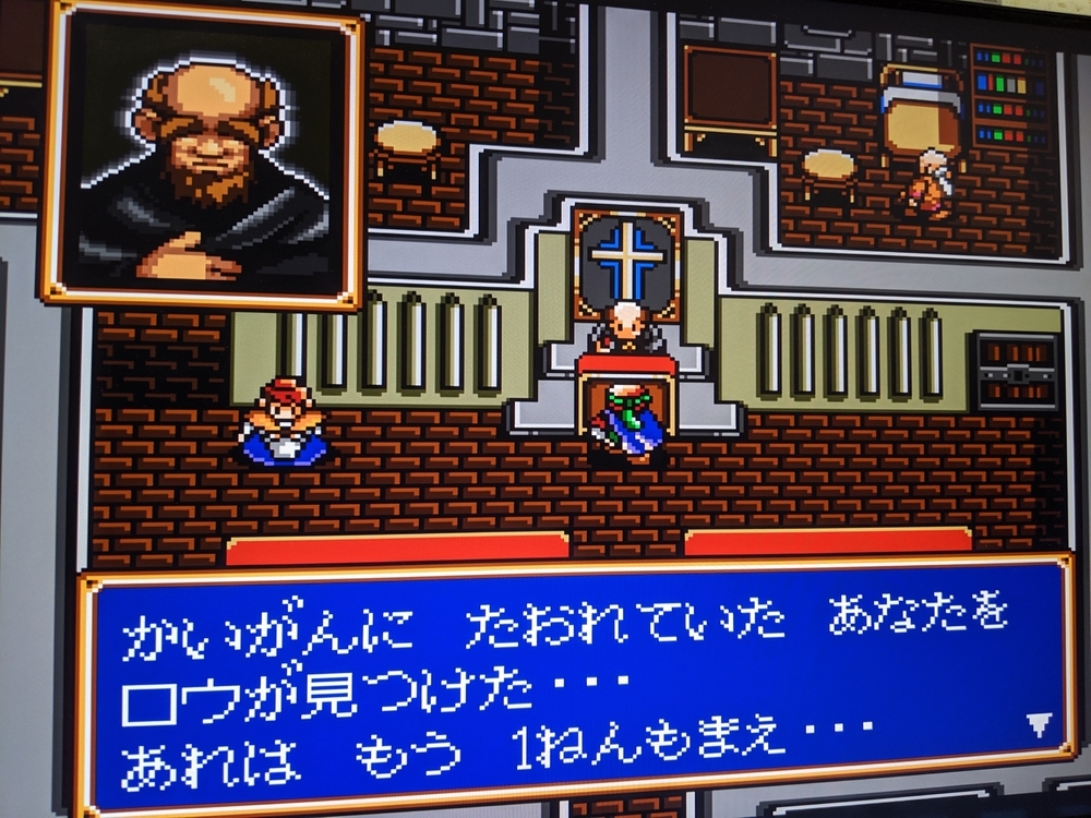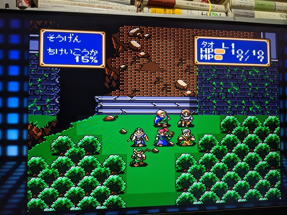 最初のマップをクリアし、ワールドマップに出ると、そのまま戦闘が続きます。タオが死んでしまったんですが、そのまま継続。教会で復活できるみたいです。