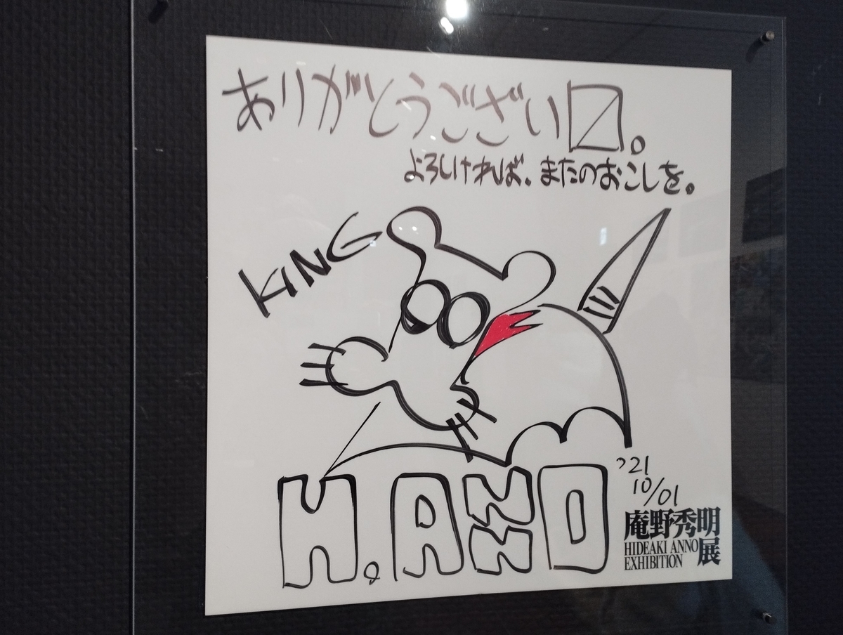 庵野秀明さんの自分の印象って「思想の人」 でした。個展の看板を見ても、絵じゃなくて文字だけで構成されています。しかし、個展の内容は、直筆による絵が多かったです。すごく失礼な言い方かもしれませんが、こんなに描いている人と思ってなかったのでびっくりしました。ドキュメンタリーで、爆発や機械の描写はすごいけど、人物はイマイチみたいな批評がありましたけど、人物もとても良かったです。エヴァンゲリオンの設定画とか、ほとんどスタッフが描いて、監督は設定だけ決めてると勝手に思ってましたが、どこかで見たあの絵この絵が直筆と知ってびっくりしました(それでも後年は、スタッフにまかせているみたいですが)。