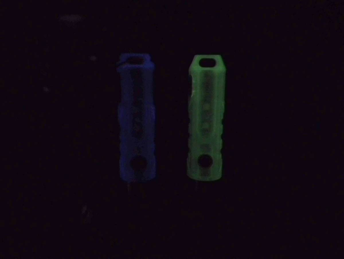 青蓄光は光は弱いのですが、長時間発光する特性があります。なので、消灯してしばらく経っても暗闇で探しやすいと思います。青蓄光って高価だし、ちょっとうれしいです(ソフビ脳)。