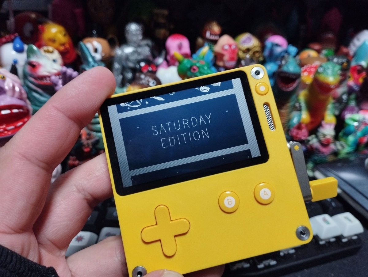 パニック・プレイデートは黄色いキュートな本体に、高精細のバックライトなし(!)モノクロスクリーン、格納式のクランク付きという尖った仕様の最新の携帯ゲーム機です。