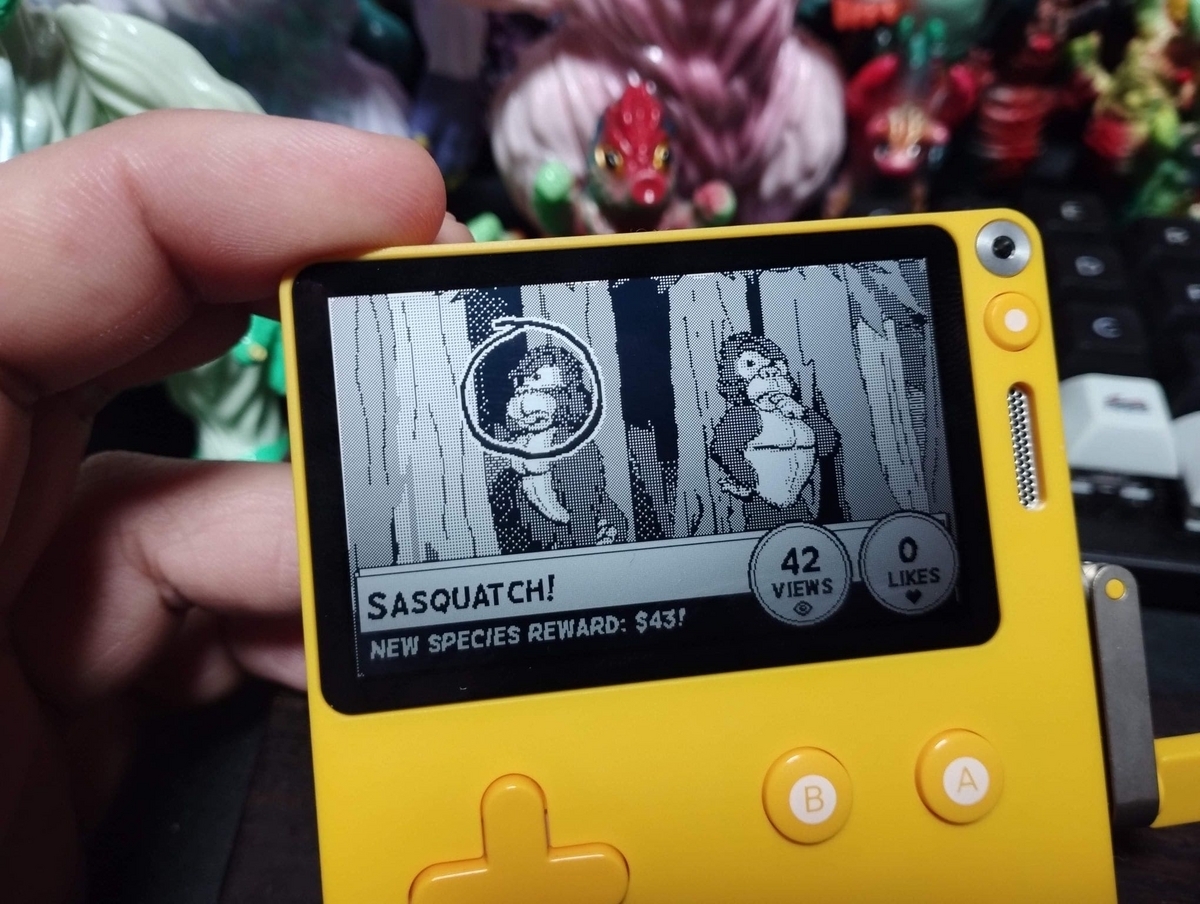 パニック・プレイデートは黄色いキュートな本体に、高精細のバックライトなし(!)モノクロスクリーン、格納式のクランク付きという尖った仕様の最新の携帯ゲーム機です。