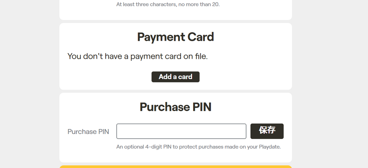 プレイデートのアカウントページに、決済カード登録とPINコード登録があります。