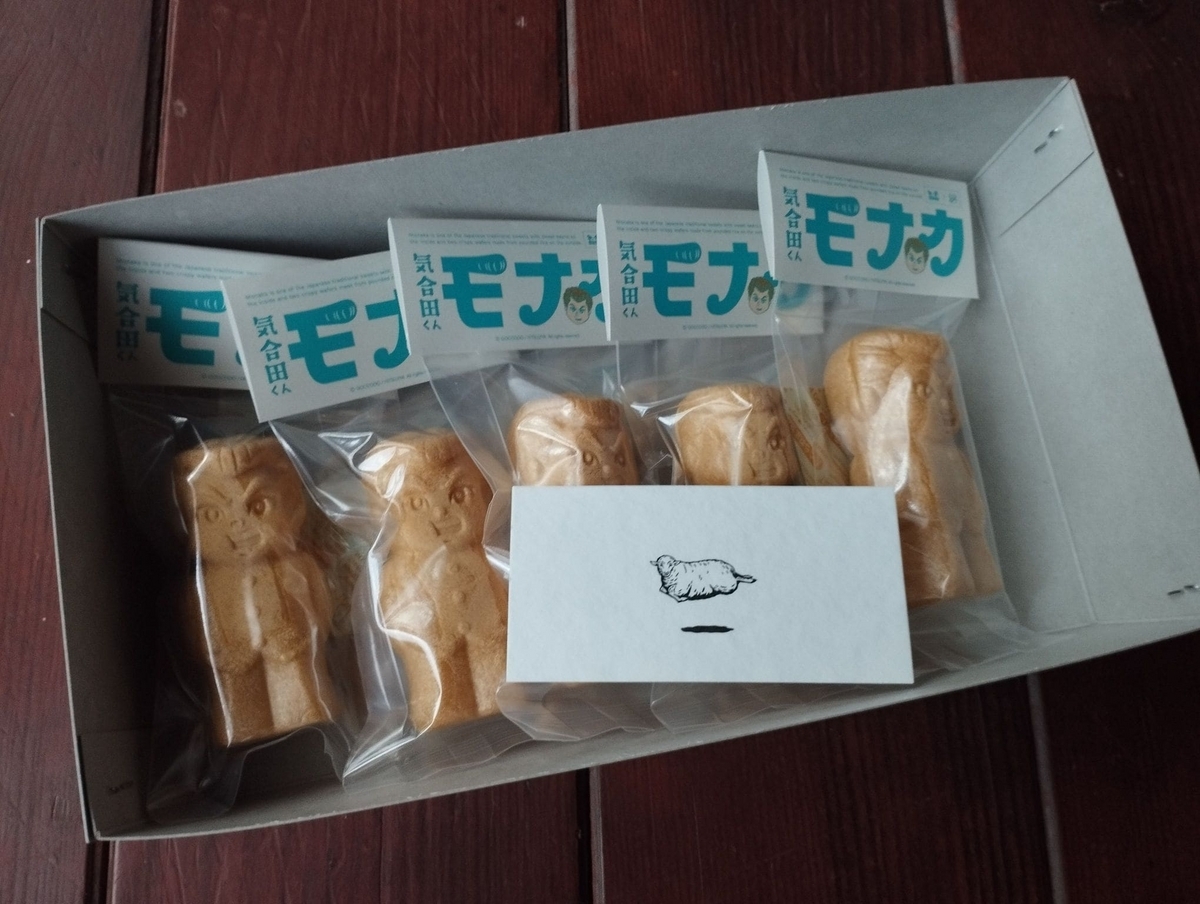 福岡県福岡市南区大橋にある和菓子と駄菓子のお店「ひつじや」 と、ゴッコ堂さんの気合田くんがコラボしたモナカです。