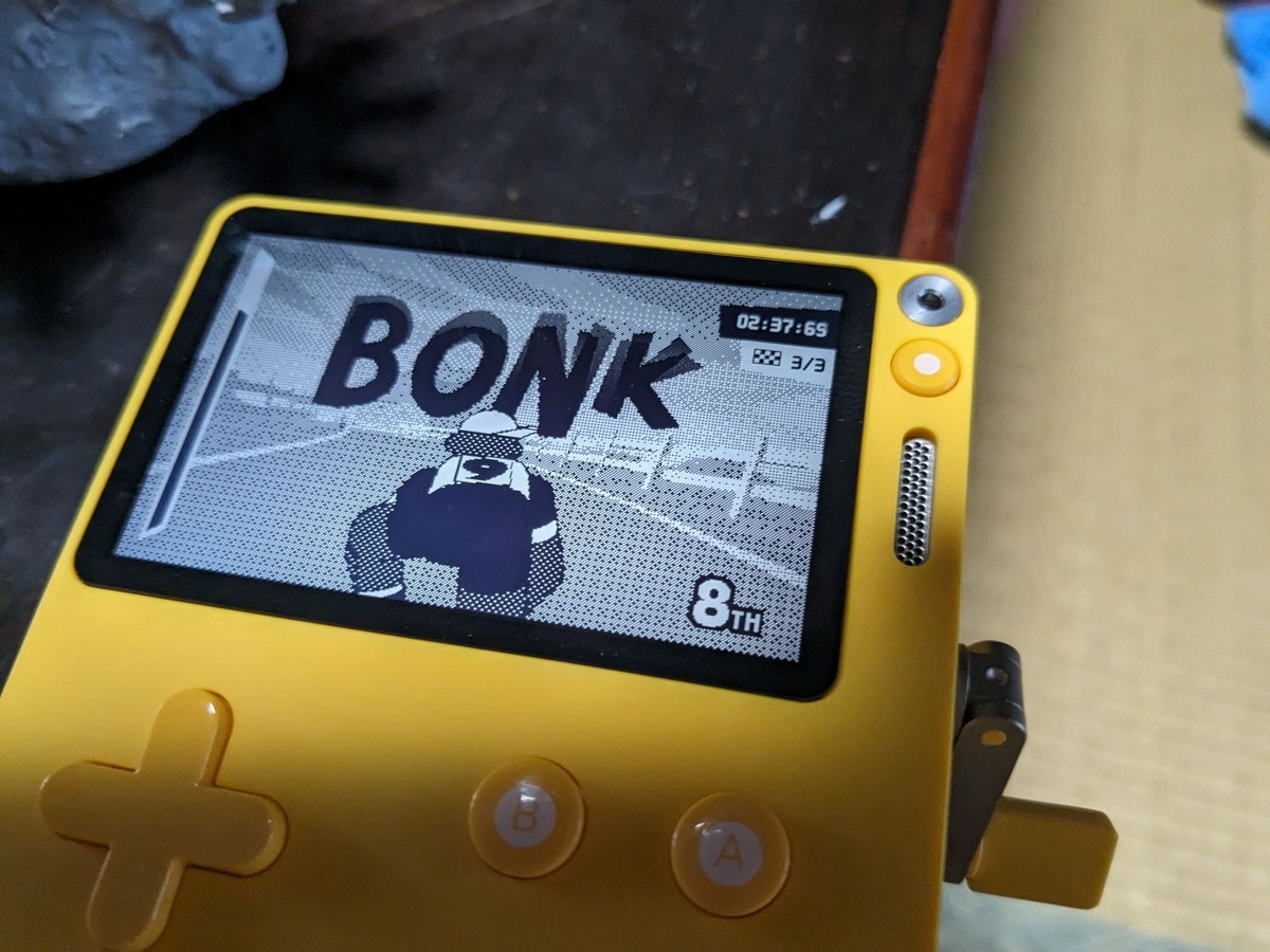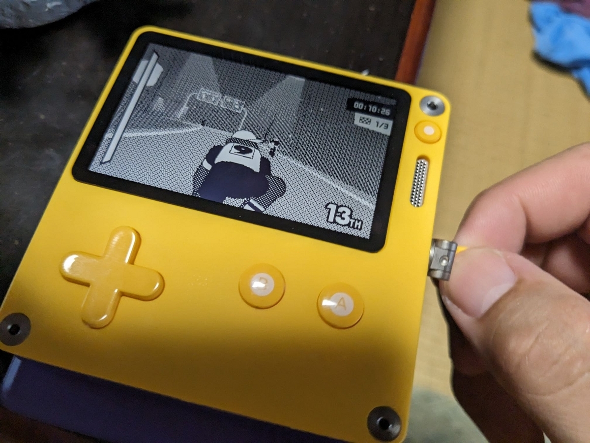 パニック・プレイデートは黄色いキュートな本体に、高精細のバックライトなし(!)モノクロスクリーン、格納式のクランク付きという尖った仕様の最新の携帯ゲーム機です。