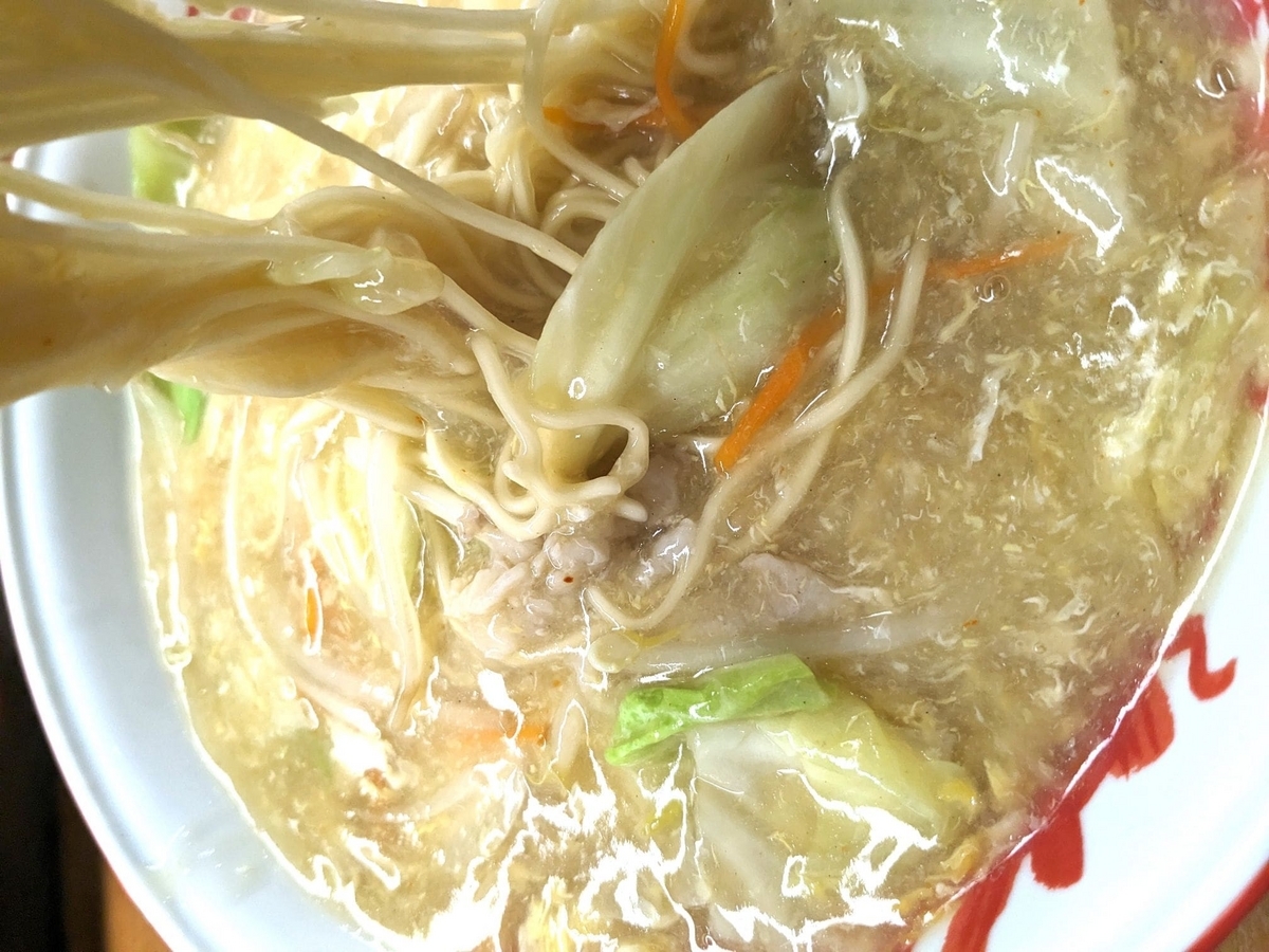 たっぷりの餡がかかったちゃんぽん麺は、とても細く餡がよく絡まる。
