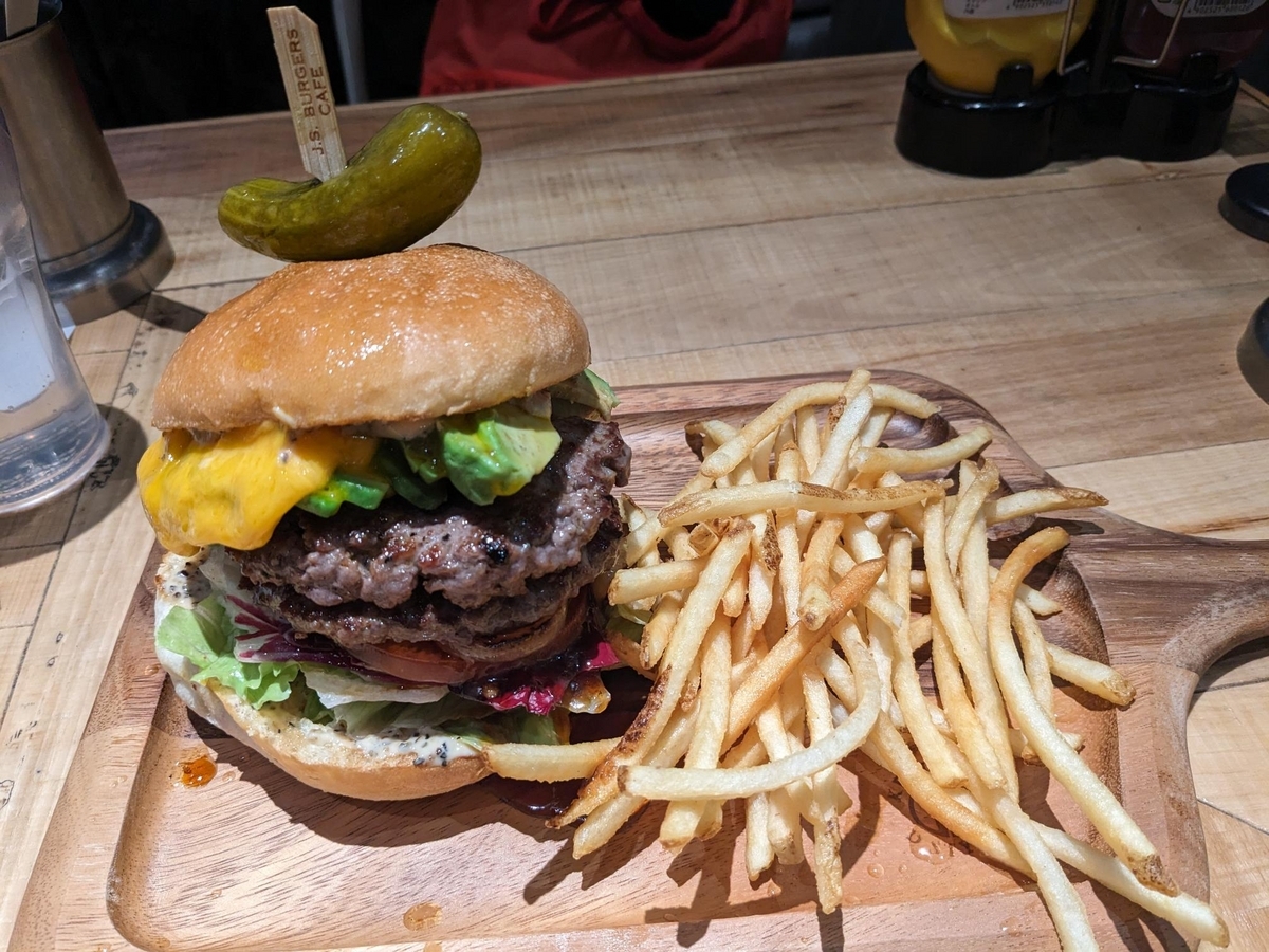 バンズはカリカリで美味しいのですが、ミートパティと他の具材の歯ごたえが全く同じ。本場アメリカの味とか言うけど、だいぶ魔改造されているような。本場の味知らんけど!!