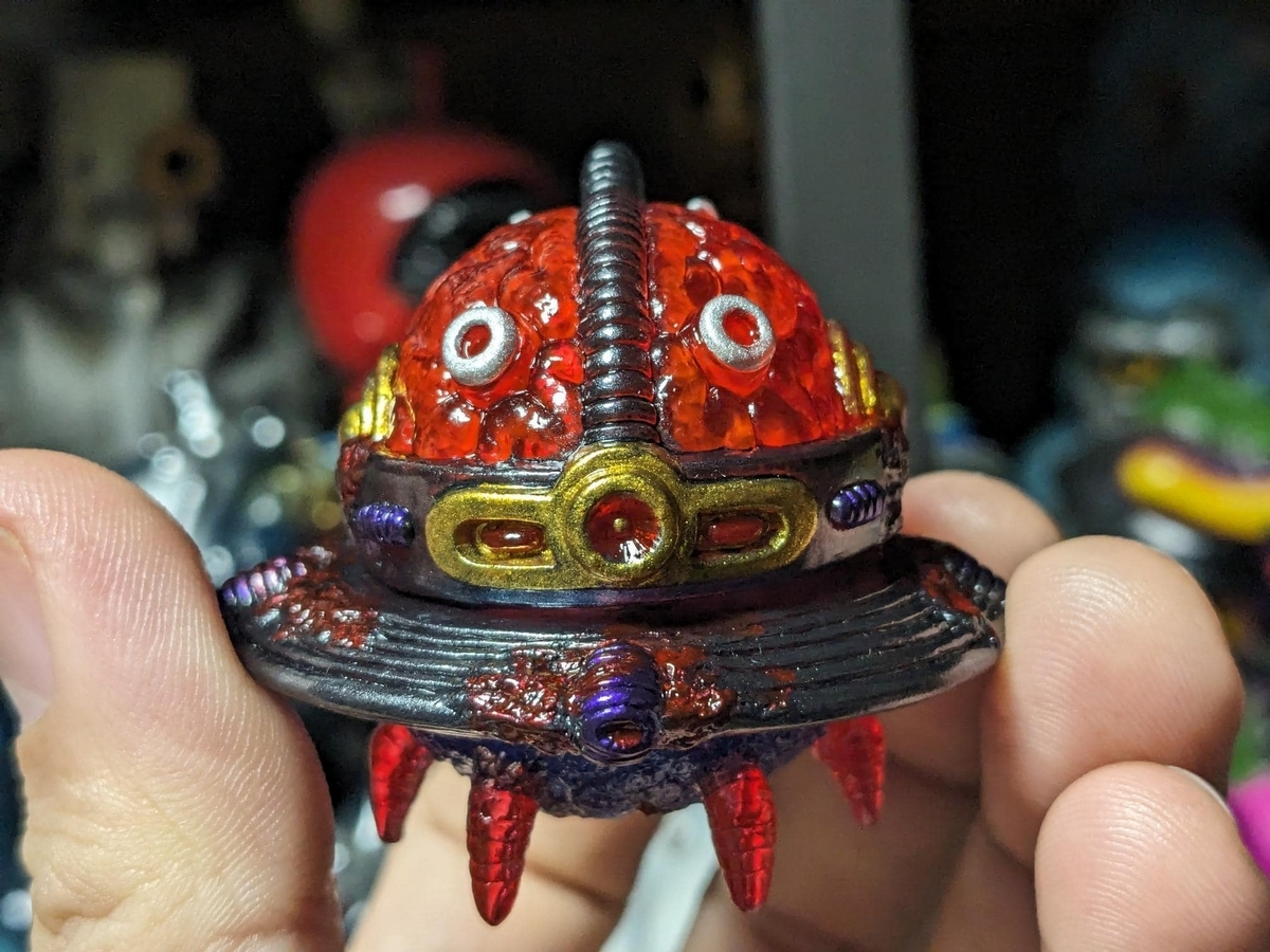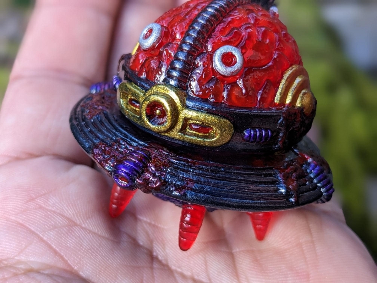 巨大な脳みそとカップソーサー型UFOという見た目です。