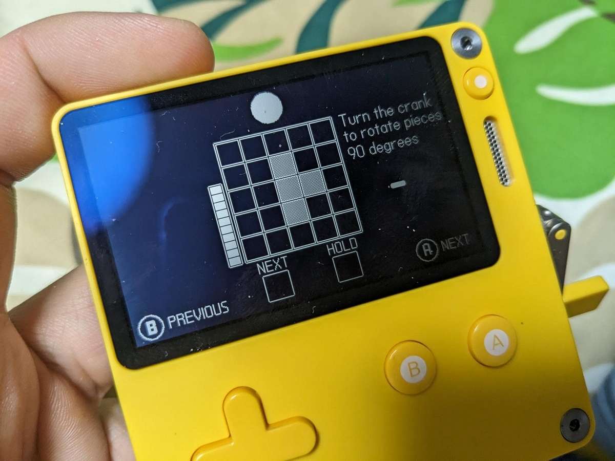 パニック・プレイデートは黄色いキュートな本体に、高精細のバックライトなし(!)モノクロスクリーン、格納式のクランク付きという尖った仕様の最新の携帯ゲーム機です。