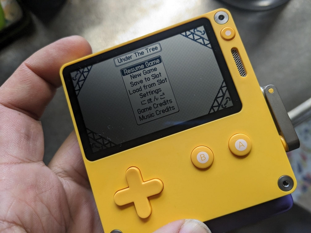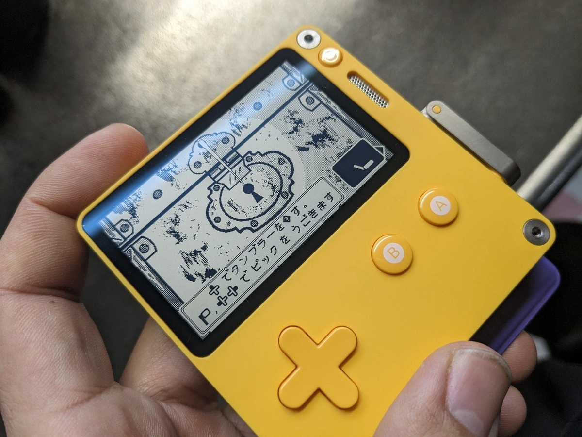 パニック・プレイデートは黄色いキュートな本体に、高精細のバックライトなし(!)モノクロスクリーン、格納式のクランク付きという尖った仕様の最新の携帯ゲーム機です。