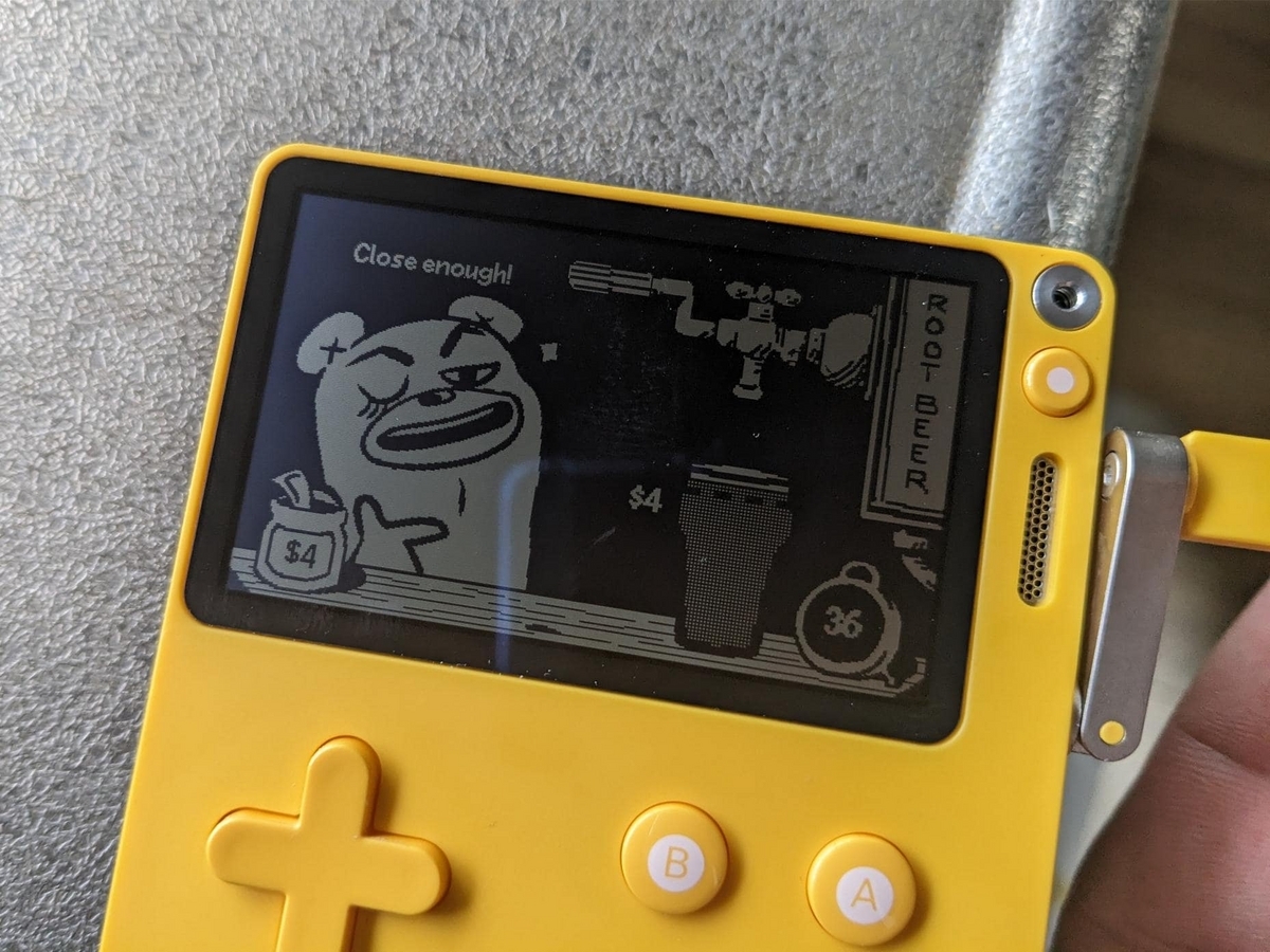 パニック・プレイデートは黄色いキュートな本体に、高精細のバックライトなし(!)モノクロスクリーン、格納式のクランク付きという尖った仕様の最新の携帯ゲーム機です。