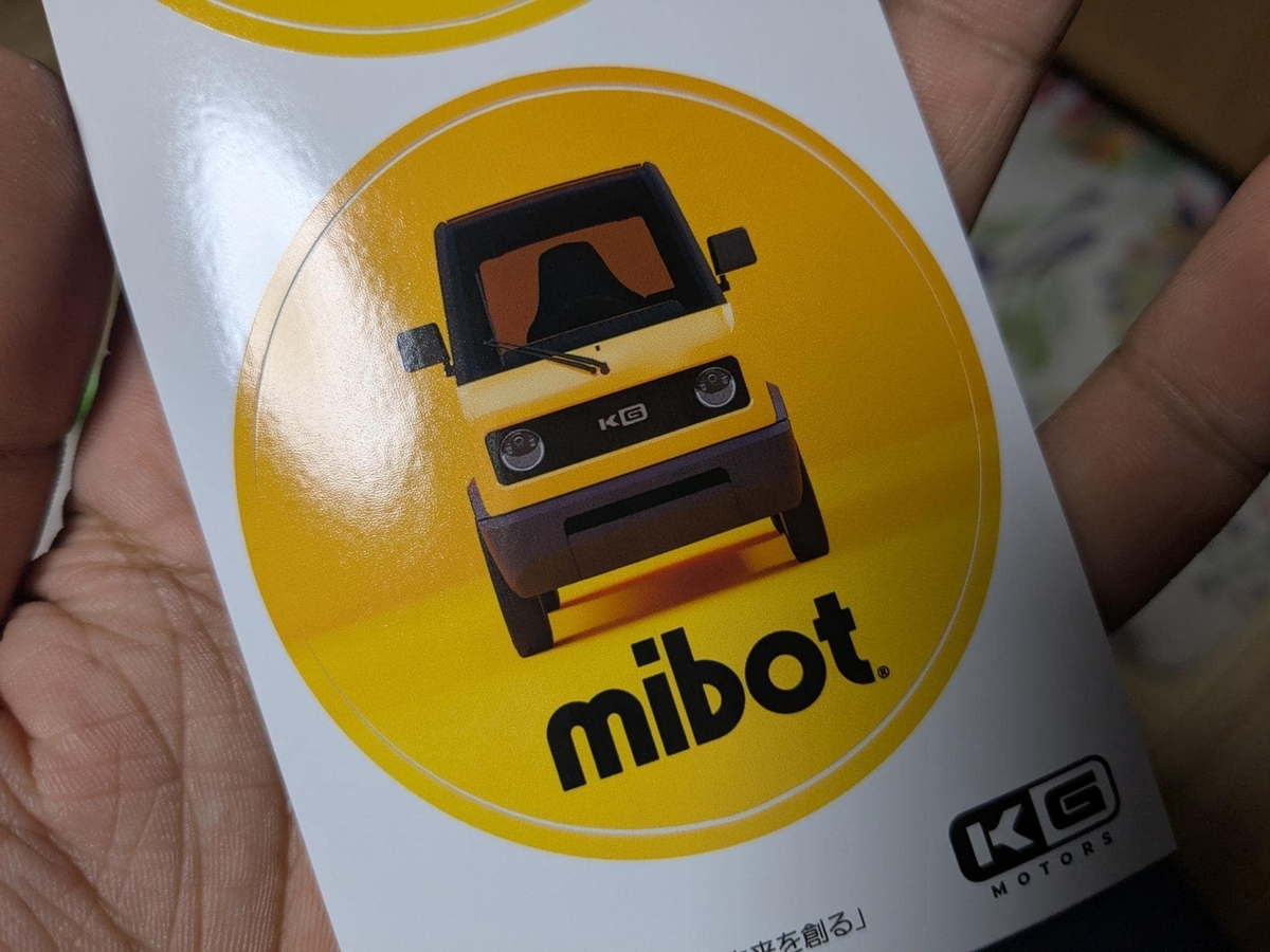 広島のスタートアップ企業兼ユーチューバーのKGモーターズが開発中の一人乗りEVのmibotのステッカーが届きました。