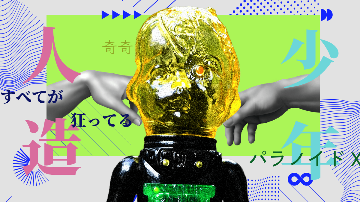 舶来のビスクドールのような、あどけなさの残る紅顔の美少年の頭部は、皮膚がめくれて、グロテスクにも脳のような部品やカメラ・アイが露出しています。