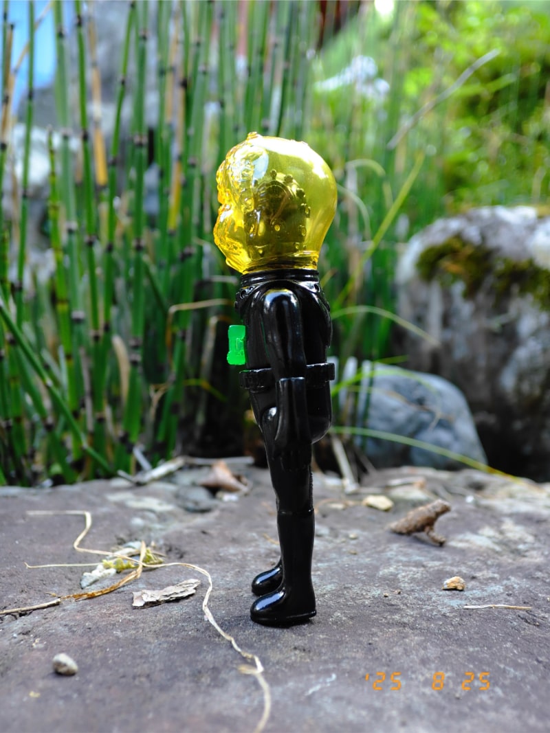 The figure is approximately 12 cm tall, 7 + 1 parts (+ 1 extra head part), and molded in clear yellow, clear green, and black.