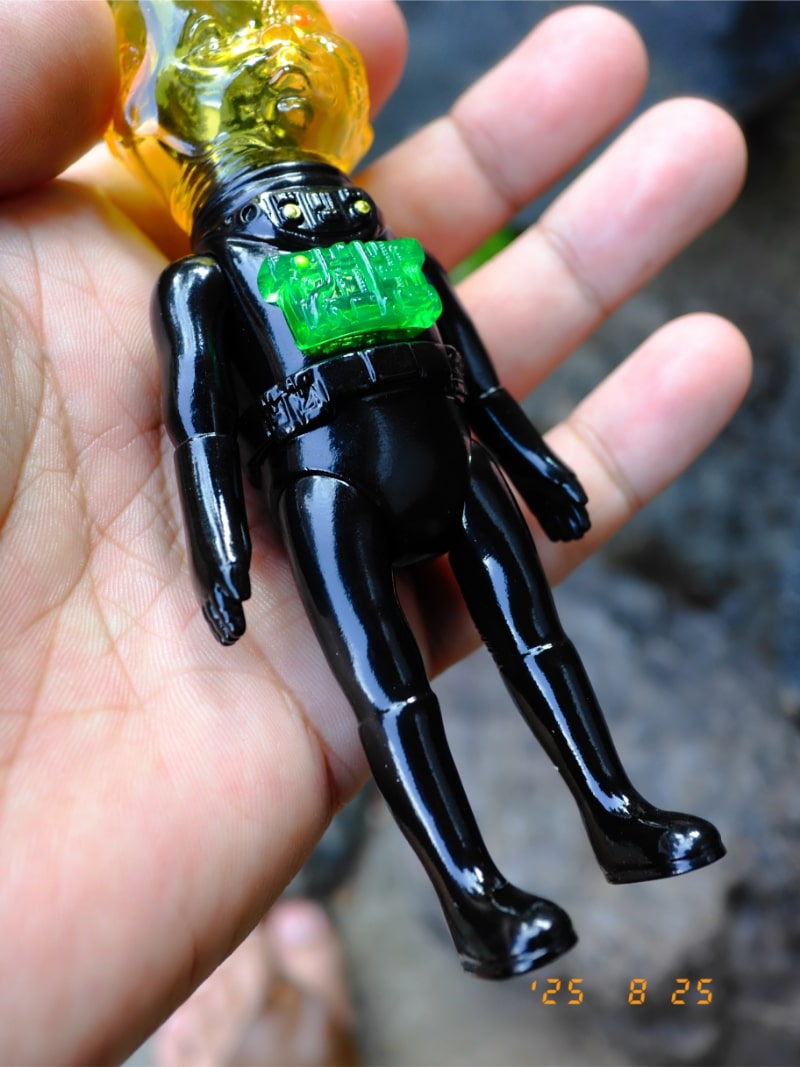 全高約12センチ、7+1パーツ構成(+おまけヘッド1パーツ)、成型色は、クリアイエロー、クリアグリーン、黒の多色成型。