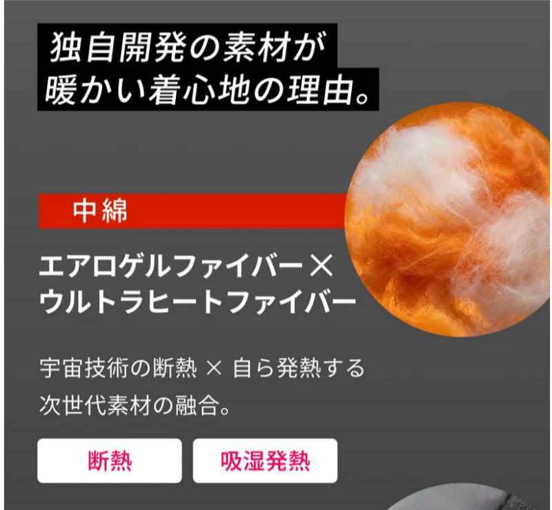 あと、中綿が普通の化学繊維ではなくて、エアロゲルファイバーとウルトラヒートファイバーという、なんか凄そうな感じの化学繊維を使用しています。